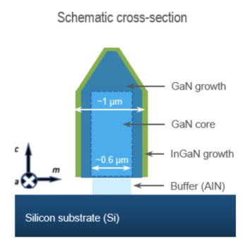 为了解决上述使用常规平面发射器的问题,研究人员已将注意力转向三维microLED(μLED)。这样的发射体的明显优点是表面积增加,而其中进一步增加的维数,允许在发射体的侧面形成量子阱。增加的维度还提供了进入各个晶面的通道。如果是GaN,它包含m平面,该m平面具有最 小的本征电场,可以减少量子限制斯塔克效应(QCSE)的影响,从而提高受激载流子的复合效率。