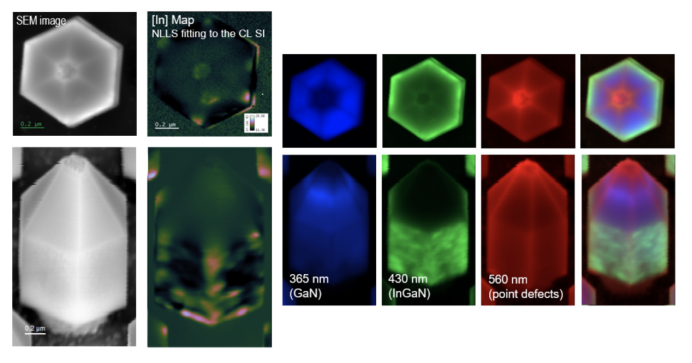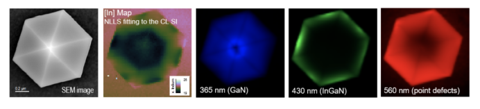 使用与先前观察阵 列外显示柱相同的数据进行采集,观察阵列内的单个柱子。同样,我们在该光谱图像中观察到每个扫描点的光谱,这可以对GaN,InGaN和点缺陷带的发射带进行Mapping,以及通过柱表面上的位置估算In的含量。这里我们可以估计InxGa1-xN中的In含量在11%至19%之间。