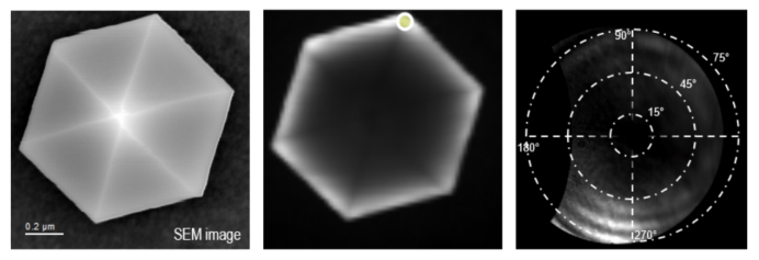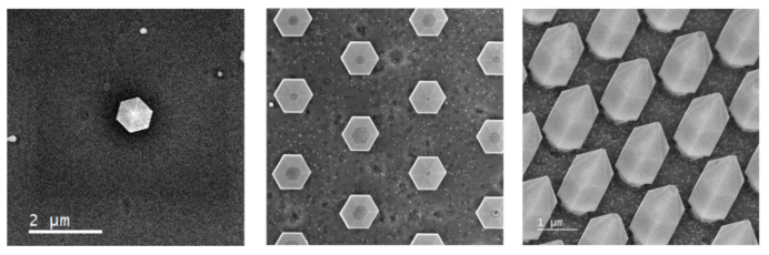 MicroLED最常见的排列方式是阵列结构。在这种情况下,阵列结构为六边形,柱宽(边到边)约为800 nm,周期(最近邻)约为2μm。这种使用GaN的阵列开启了光子影响光学性能的可能性。因此,在这样的阵列中观察它们以确定对发光的影响是非常重要的。
