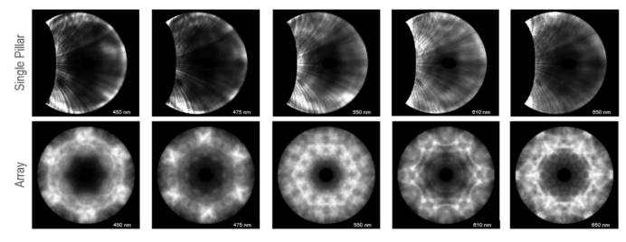 下面是几种不同波长下的WARCL对比图。阵列外和阵列内LED均在垂直于柱子的方向上发出较弱的光。但阵列中的器件仍存在十分令人关注的特点,展示了WARCL技术对于microLED阵列研究的实用性。