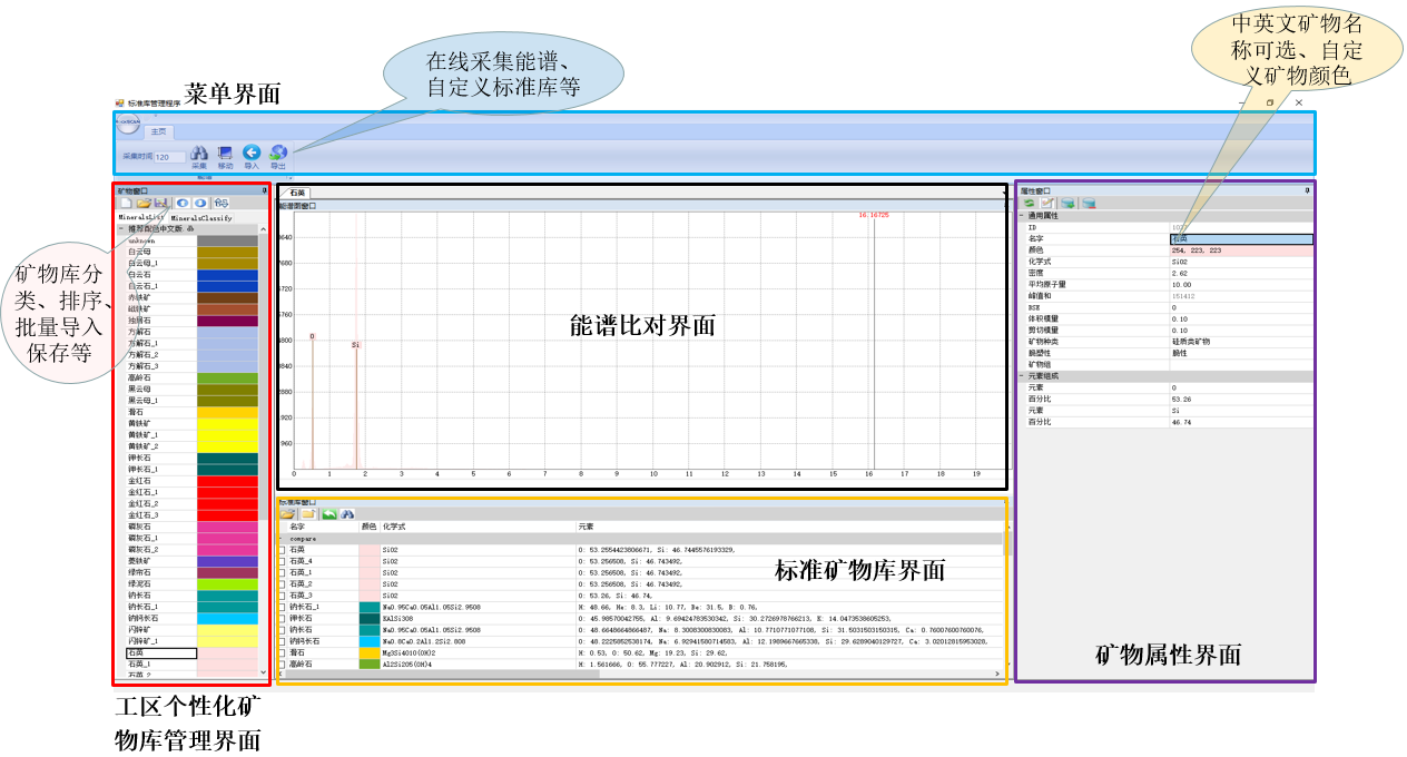 包含zhuan利技术的矿物识别算法保障了矿物识别的准确性,尤其是难以识别的粘土矿物;此外,提供了矿物标准库的管理功能,可以新增和更改为符合研究区的矿物库,使得矿物分析更具适应性和准确性。