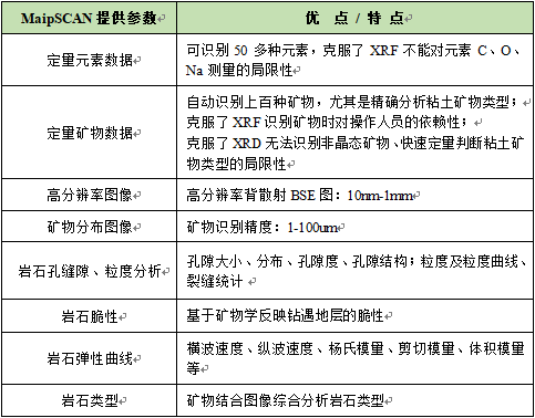 2、参数全:MaipSCAN可以提供丰富的数据结果,包括岩石的矿物和元素定量数据、高清电子图像、伽马元素、孔隙度、孔隙结构、微裂缝(弱面指数)、弹性参数及脆性指数等多个勘探开发关键参数。