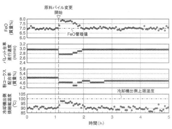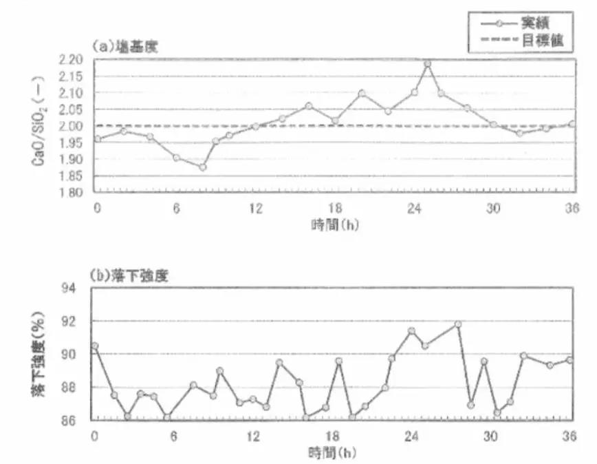 下图为日本JFE钢厂,实际烧结生产中记录的对碱度控制的结果,以及测得的烧结矿落下强度质量的结果:
