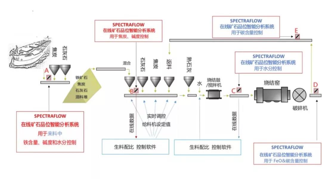 在烧结生产中,来料质量控制是保证混合效果的一步;混料中配料的精细混合,是保证优 质烧结效果的前提。SpectraFlow在线矿石品位zhi能分析系统除了可以在A/B位置(如上图)安装,检测和控制来料和混料,还可安装在C/D/E处,针对性的调节混料中水分和燃料等相应成分的配比,保证烧结窑炉的温度稳定。
