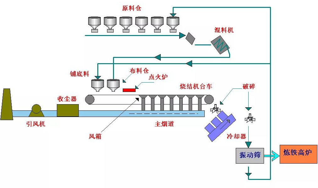 烧结是钢铁生产工艺中的一个重要环节。烧结生产的主要流程为将铁粉矿、各类助熔剂及细焦炭等原料,经由混拌、造粒后,通过布料系统加入烧结机,完成烧结反应。经破碎、冷却、筛选后送往高炉,作为冶炼铁水的主要原料。经烧结而成的,有足够强度和粒度的烧结矿是炼铁的熟料,利用优zhi的烧结熟料炼铁,对于提高高炉利用系数、降低焦比,提高高炉透气性,节能降耗、保证高炉高效运行均有重要意义。