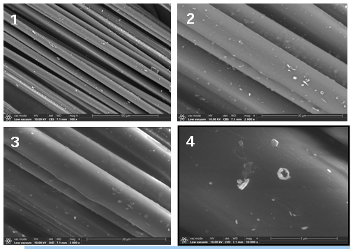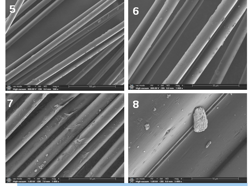 上图1~4是纤维样品在不喷金,低真空模式下拍摄的图片。1、2为背散射图像,3、4为二次电子图像,在两种图像模式下,Axia均表现出优异的成像功能。AxiaChemiSEM提供的低真空模式,可调节压力到zui高150Pa,支持各种不同的样品。