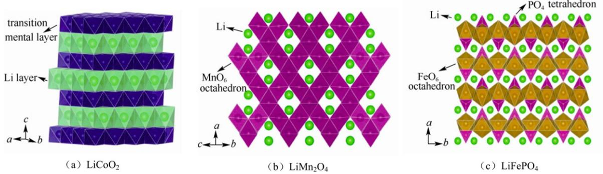图2 常见锂离子电池正极材料的结构:六方层状结构 LiCoO2、立方尖晶石结构 LiMn2O4正极材料、正交橄榄石结构 LiFePO4材料