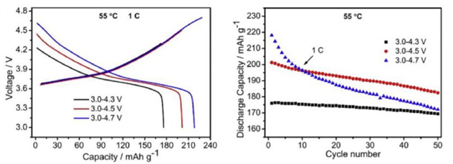 图6 (左图)充电电压提升,三元的比容量将提高;(右图)同时会使得正极材料的循环性能降低,容量保持率下降