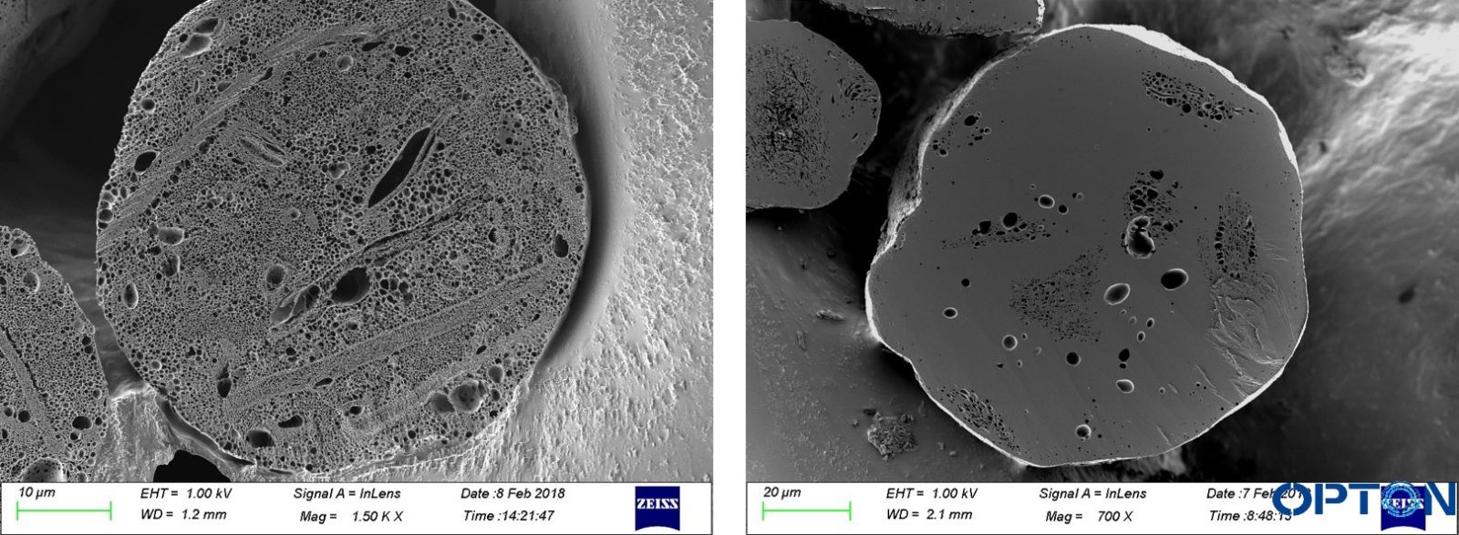药品1#和2#SEM成像如下,可见,1#样品表面和内部均有大量孔洞,2#则相反。