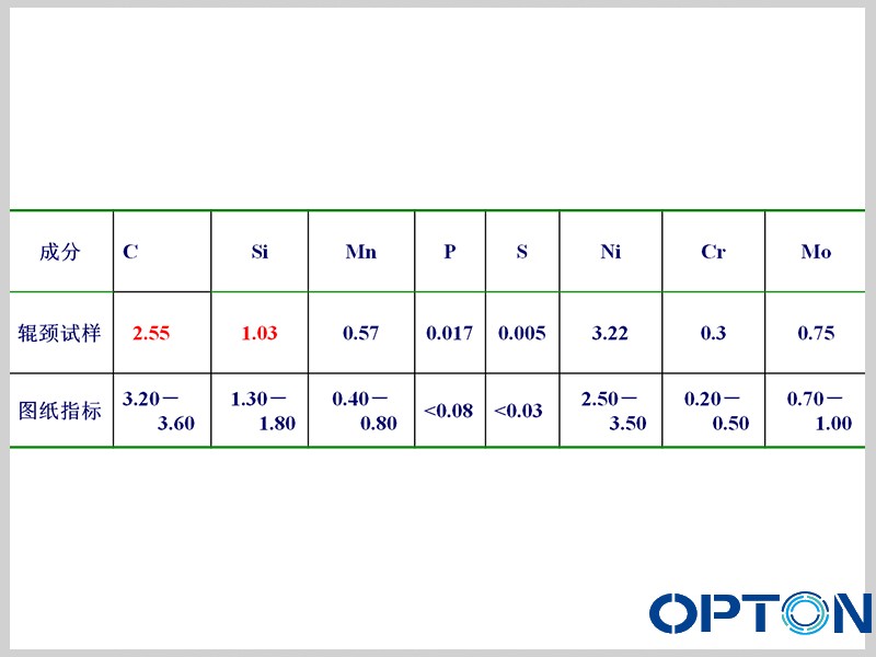 轧辊辊颈C、Si含量明显偏低,不符合技术要求。