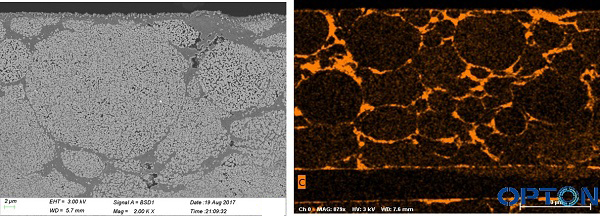 通过对电池极片截面观察,涂布均匀性分析,可知该极片中,碳纳米管分布不均导致电池性能差,通过软件自动分析及图片智能识别统计技术,可将二维图片转化为数值来对材料微观结构进行评估