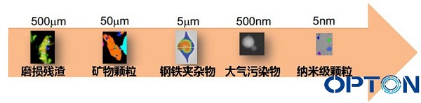 检测汽车引擎磨损后所余残渣,得到颗粒尺寸及成分分布情况,说明各部件磨损情况,据此判断零件更换周期等