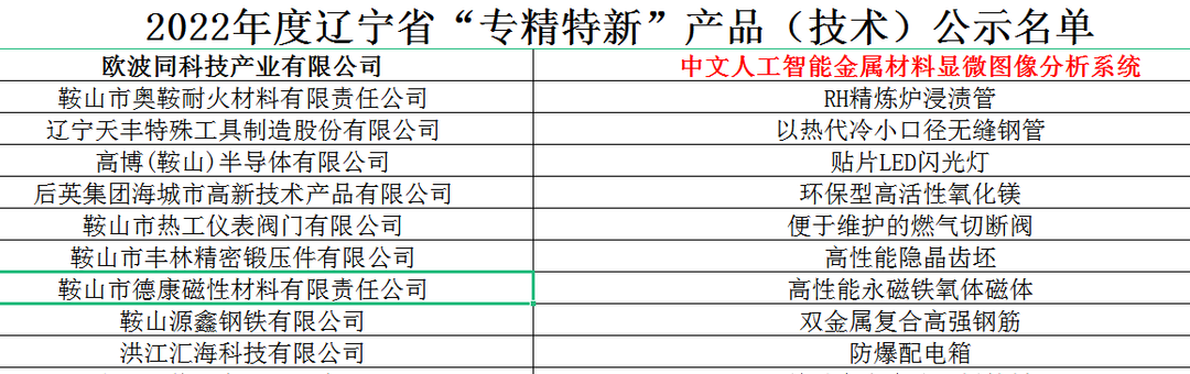 日前,辽宁省工业和信息化厅网站发布了《关于2022年度辽宁省“专精特新”梯度培育企业名单的公示》。欧波同科技产业有限公司(以下称:欧科产)入选2022年度辽宁省专精特新中小企业名单,由欧科产自主研发的中文人工智能金属材料显微图像分析系统被评为辽宁省2022年度专精特新产品。