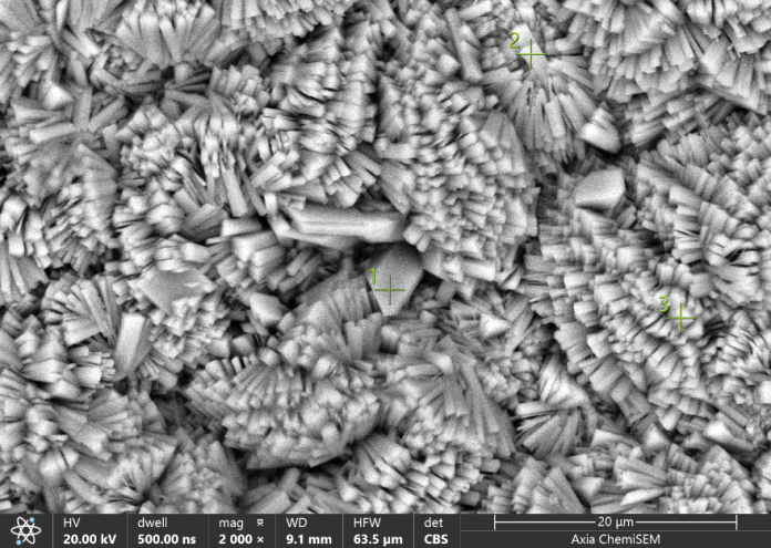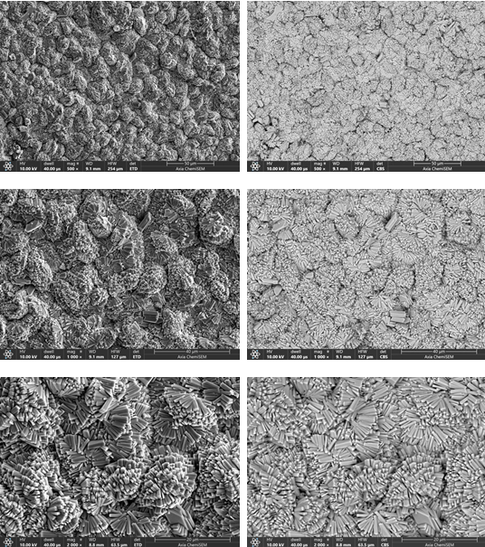 下图为镁合金表面的锶磷化膜在Axia ChemiSEM钨灯丝扫描电镜下的SEM图像,我们的Axia ChemiSEM扫描电镜配备高质量的ETD和CBS两种探测器。CBS、ETD探测器可以同时成像,既可观察成分衬度,又能获取形貌信息(左图为ETD成像,右图为CBS成像)。从扫描电镜中我们可以清晰的看到磷化膜层均匀致密地覆盖于镁合金表面,有长方体形状的晶体错落堆叠,尺寸不一,但彼此间紧密挨连,几乎没有缝隙。