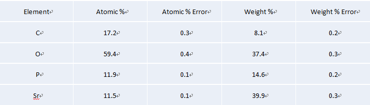 利用Axia ChemiSEM扫描电镜标配的能谱对锶磷化膜的表面进行成分分析,分析结果如下,从能谱的结果中我们可以清晰的知道该膜层含有C、O、P、Sr元素,分析结果准确、高效。