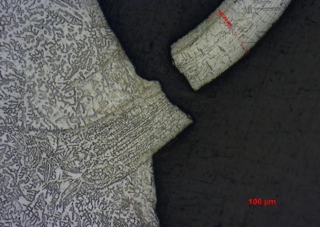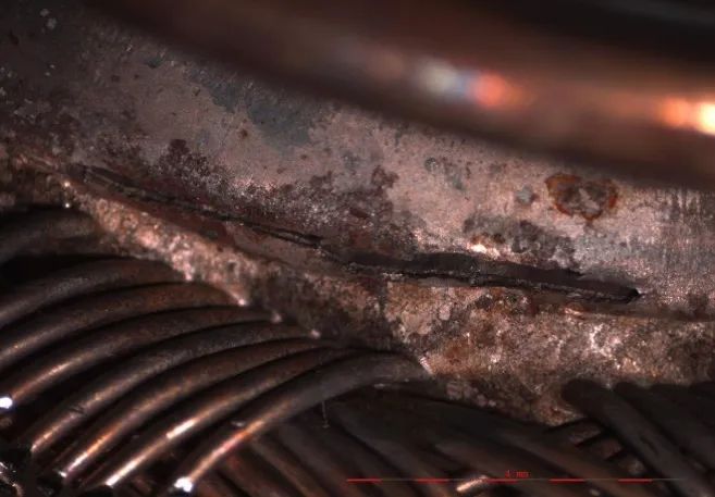 接下来要使用的更为精密设备和复杂的制样来观察分析。众所周知,机械行业大多传动部件其加工过程中都要热处理,其目的就是通过改变材料组织进而优化材料机械性能。对于生产检验,一般测试机械性能就可以了,但是对于失效分析,想要查清问题背后的原因,仅测性能是不够的,需要观察组织去了解影响性能背后的原因。观察组织就要用到材料领域的——金相显微镜。这里使用的是金相显微镜,其可在50-1000倍观察样品。图 3、图4和图 5是使用显微镜拍摄的照片。其中开裂确切位置清晰可见——焊接热影响区,同时可见波纹管管壁痕迹,表明母材与焊料熔合不是很好,管壁裂纹起始位置可见细小的晶间裂纹。