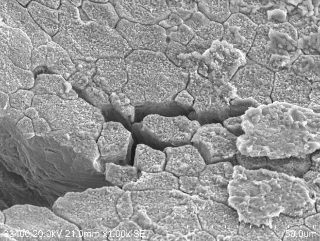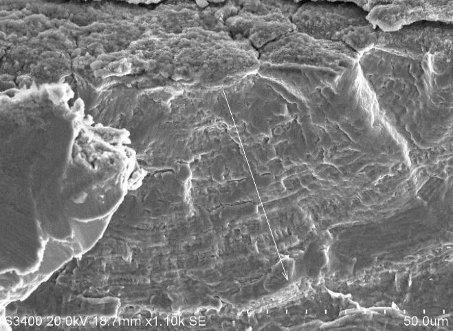 失效分析当中的重头戏——断口分析,其要使用的设备也是失效分析中重量级的设备——扫描电子显微镜,简称SEM。SEM以其出色的放大倍数和观察景深而闻名。随机配备的能谱仪,更使其如虎添翼,使得其在失效分析领域大放异彩。图6 、图7 为使用SEM拍摄到的波纹管断裂面的照片,其清晰告知断裂模式为晶间腐蚀—疲劳断裂。
