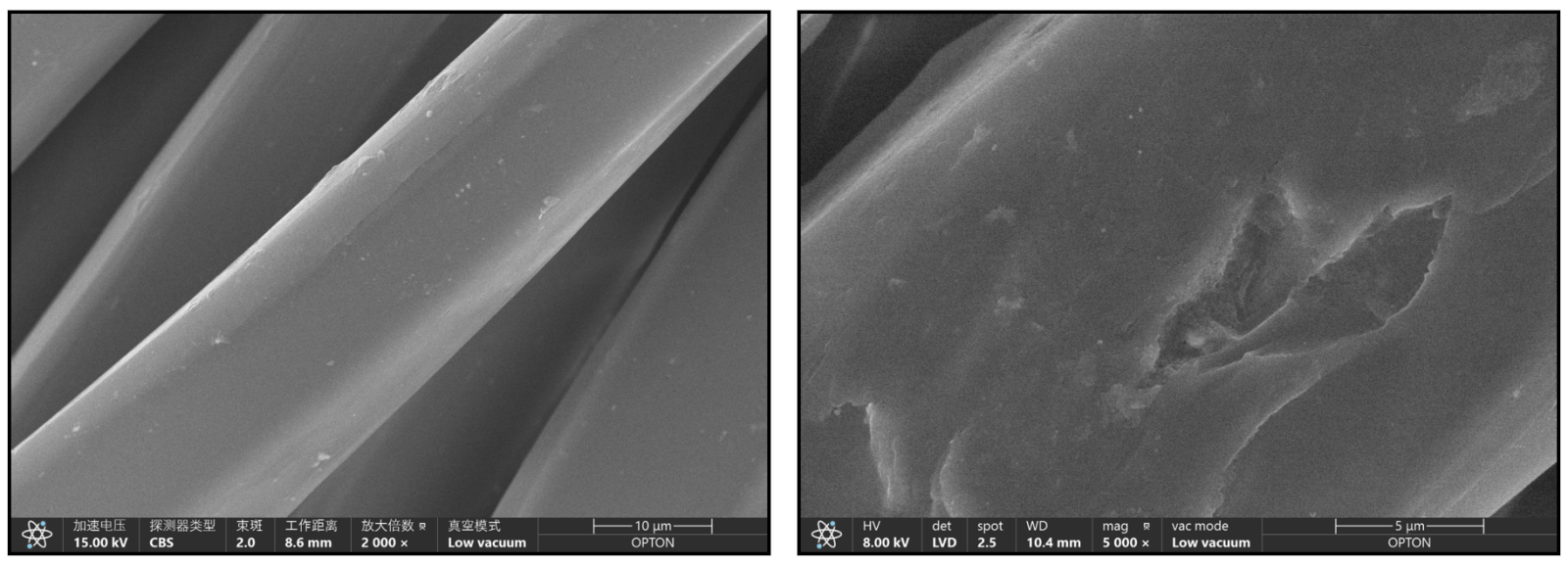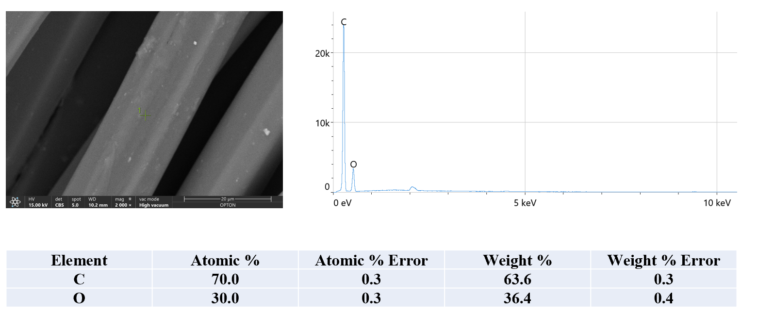 全新一代 Thermo Scientific™️ Axia™️ ChemiSEM 智能型钨灯丝扫描电镜,可在低电压及电子束减速模式配合经典的 CBS 探头(同轴环状背散射探头)对不导电样品在不镀金的条件下的成像性能,在不镀膜的情况下对不导电样品进行更真实的能谱元素分析。可用来观察各种经物理、化学处理后的纤维的真实形貌,再通过扫描电镜获得的形貌信息和成分信息,帮助客户对纤维材料的生产工艺进行合理的选择和改善。