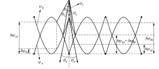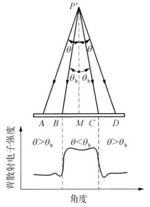 对于波长为λ的入射电子束,随着相对于晶面(hkl)入射角度的变化,见图3,其通道波和散射波的振幅是不同的,从而导致它们发生背散射的几率不同。ΨA振幅越高,发生背散射的几率越小,反之,则发生背散射的几率越大。