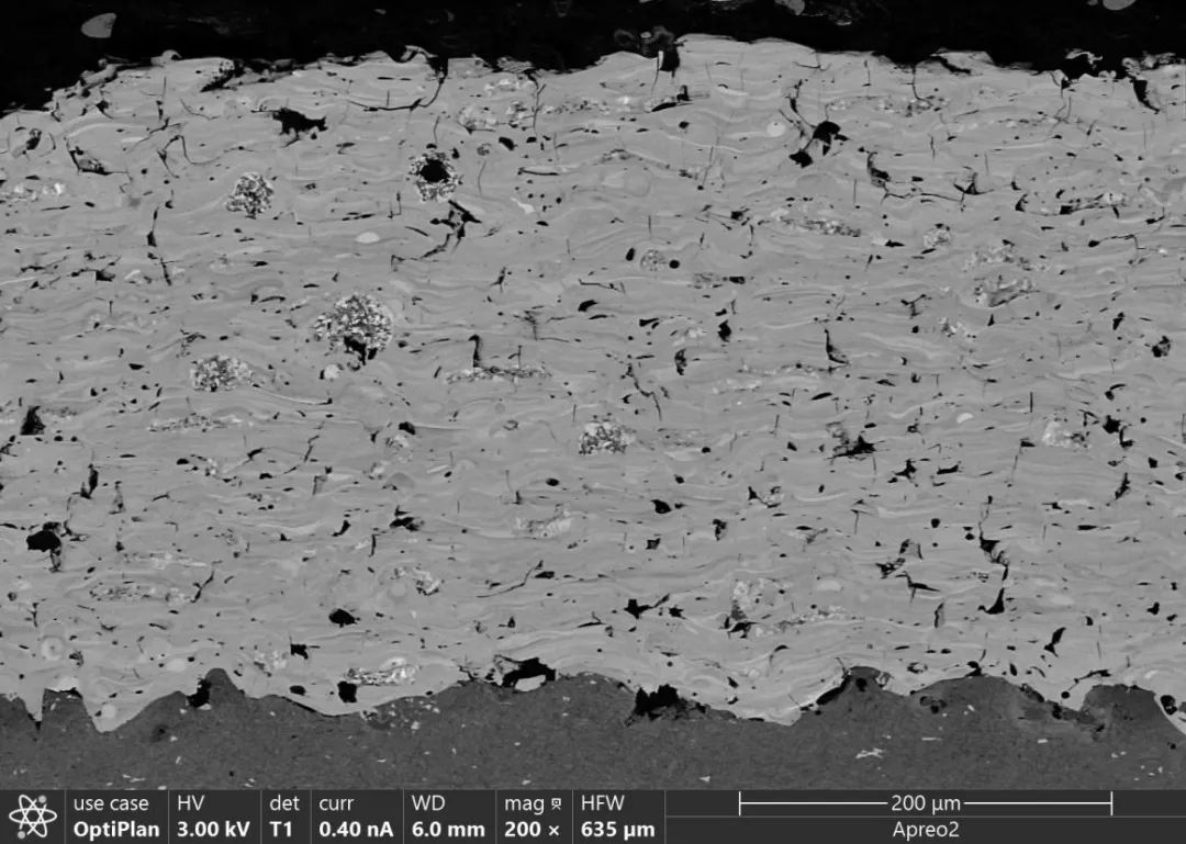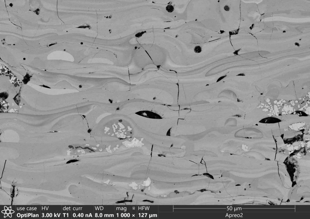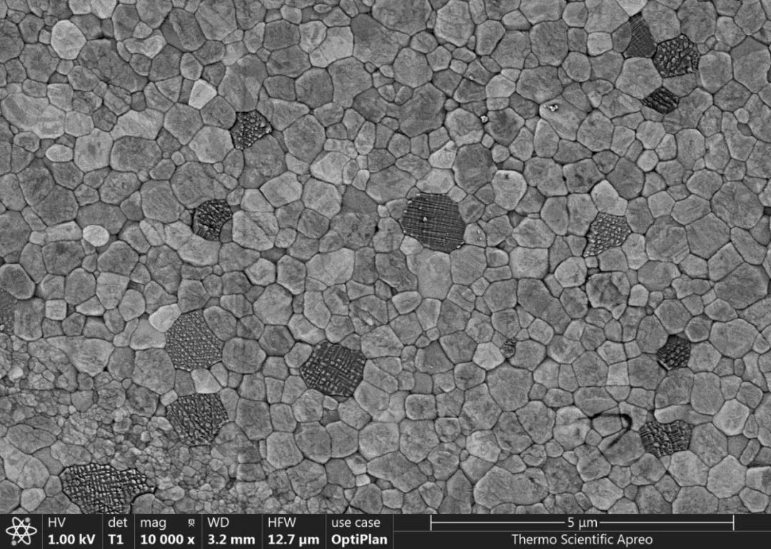 根据通道效应的特征,其在材料领域具有非常广泛的应用。锂离子电池三元正极材料的单个粉末颗粒是由许多不同取向的小晶粒构成,通过氩离子研磨仪对颗粒进行精细研磨,从而获取平整光洁的截面。在赛默飞Apreo 2扫描电镜的T1背散射探测器的帮助下,可以轻松获取颗粒的通道效应衬度像,进而清楚观察到各个晶粒的取向,见图4。在钢铁行业,我们需要观察金属内部的晶粒取向、晶粒形状、位错情况等,来改善金属的制造工艺。见图5,通过T1背散射探测器观察到不同取向的晶粒、不同的成分衬度、不同的晶粒形状等丰富信息。图6展示了陶瓷材料的通道效应衬度像,以不同的灰度来一目了然地区分不同取向的陶瓷晶粒。