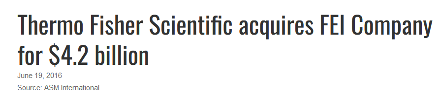 不夸张的说,赛默飞世尔科技用42亿美金成功并购FEI非常划算,也是一个双赢的合作。赛默飞通过FEI的Cryo-TEM技术来研究蛋白质的结构,补充了赛默飞的质谱在结构生物学中的领先地位,使赛默飞世尔公司处于利用这一重要趋势的位置,同时推动生物制药的发展。另一方面,借助FEI电镜独特的成像技术,赛默飞将扩大其在材料科学市场的影响力。更重要的是,赛默飞世尔将受益于FEI在半导体市场的强大影响力,在这一客户群中创造新的增长机会。