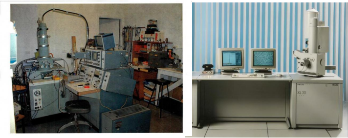 图5 (左图)世界上的首台ESEM,1978年在澳大利亚由Danilatos博士制造,(右图)收购ElectroScan后推出的带场发射电子枪的ESEM
