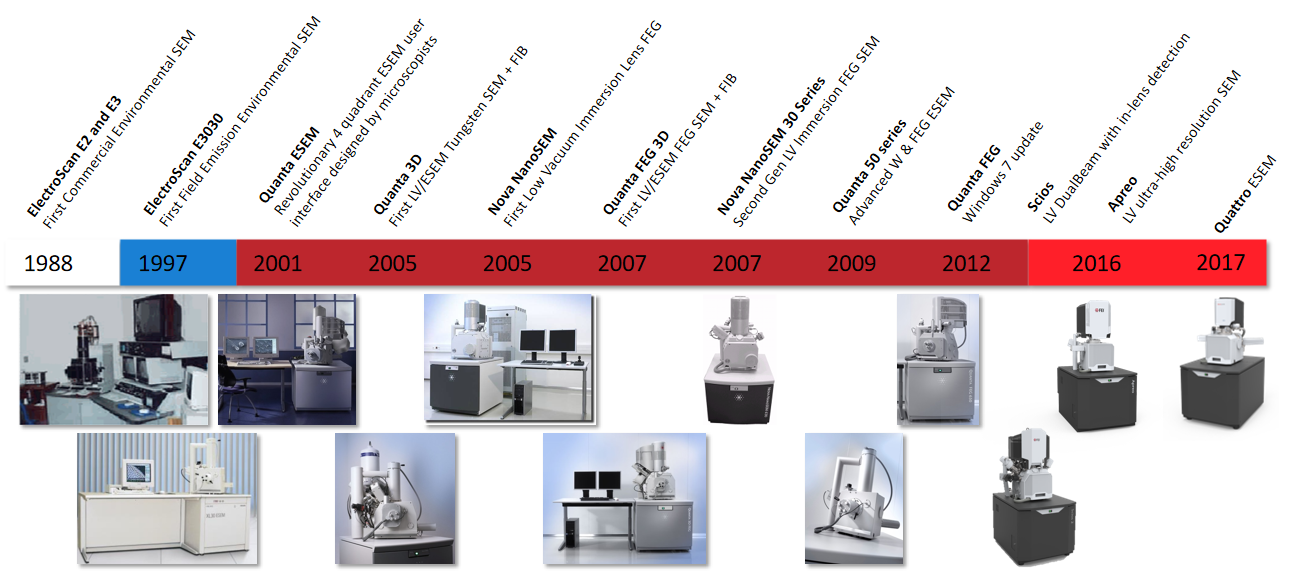 飞利浦于1972年进入扫描电子显微镜(SEM)市场,仅仅在剑桥仪器公司推出他们的立体式扫描电子显微镜七年后。当时推出的型号是PSEM500,在二次电子模式下能够具有大约10 nm的分辨率。其他系列的SEM出现在1977年(SEM501),1990年(SEM XL型号)以及1997年带有六级透镜的FE-SEM (场发射扫描电子显微镜),能够在常规电压和非常低的加速电压下提供清晰的图像。