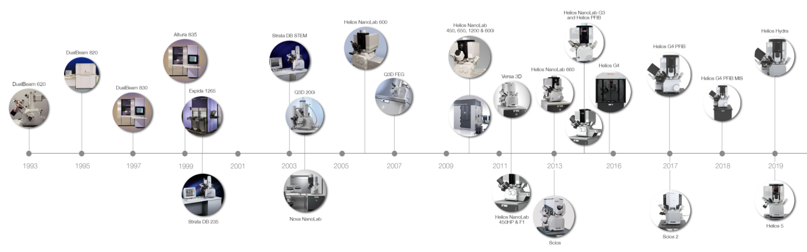 在20世纪90年代初,FEI与飞利浦电子光学公司(Philips Electron Optics)结成联盟,共同开发一种创新的新产品。飞利浦在电子光学方面的经验可以追溯到20世纪30年代,它在1949年制造了世界上首台商用透射电子显微镜,并在随后的几年中负责该领域的一系列进展。1990年,飞利浦公司推出了一台适合用于六英寸半导体晶片的扫描电子显微镜(SEM)。1993年,FEI和飞利浦将他们的技术结合起来,创造了首台双束(FIB/SEM)工作站。