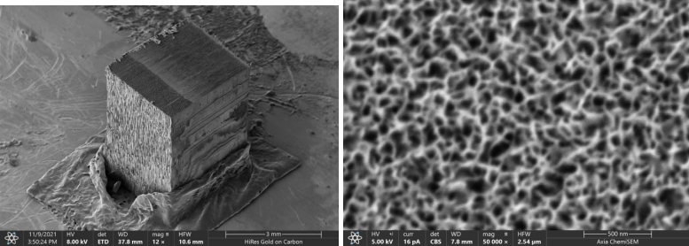 图10 (左) 木材,12X(右)阳极氧化铝孔 50K X