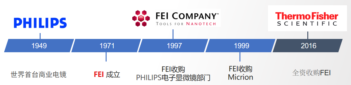 在电镜市场扬名51年后,飞利浦公司负责设计和生产的电子光学部于1997年被美国FEI公司收购,飞利浦电镜系列从那时起就更名为FEI系列电镜,但骨子里一直还是飞利浦电镜。
