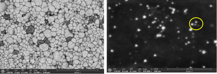 图12 (左图)氧化铝增强氧化锆陶(右图)溶菌酶-纳米银复合材料,黄色圆圈位置,可见尺寸约5nm左右银颗粒