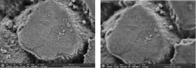 如何避免非导电样品的荷电效应一直是高分辨成像的难题,高分子和生物类样品,还容易受到电子束的损伤。常规喷金手段所使用的黄金和白金靶材,其颗粒都会掩盖纳米颗粒的细节。利用背散射探测器可以抑制荷电效应,但传统的半导体探测器有能量阈值的限制,在小于2kev加速能量时,几乎采集不到信号。而T1探测器不存在能量阈值,且设计在极靴附近的位置,充分利用背散射电子空间发射的特点,在低电压和低束流下也拥有非常好的信噪比,在材料科学与生命科学领域,有着优异的成像表现。