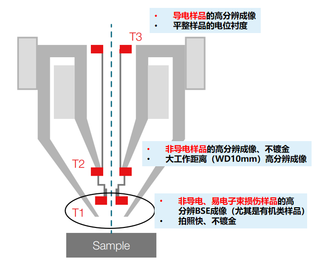 对于很多不太熟悉SEM操作的技术人员来说,在不同加速电压切换时,要得到清晰的图片,成像所需要的时间一半多都消耗在了合轴上,而不需要合轴的设计能极大的提升工作效率。