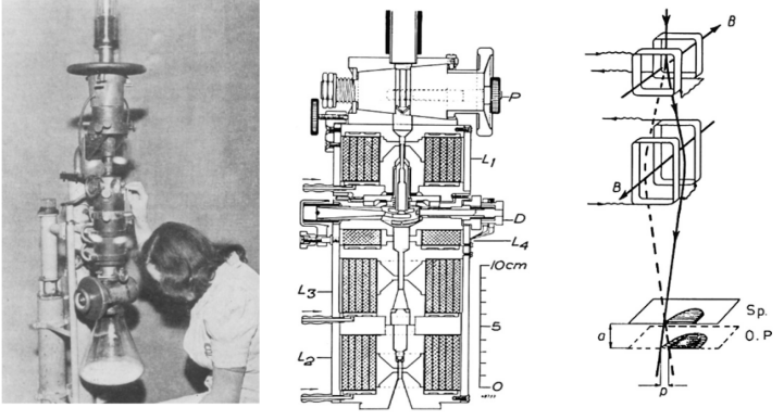 图2 (左图)150 kV电子显微镜,像场投射到沉积在锥形玻璃烧瓶底部的荧光材料上,1947年;(中图) 150 kV电子显微镜的电子光学柱横截面, 1944年;(右图) “摇摆”辅助聚焦设计图纸, 1946年