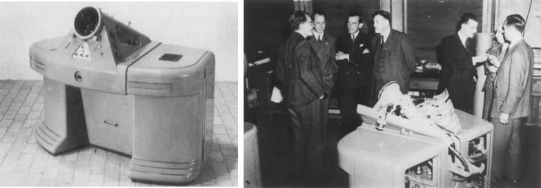 图 5 (左图)飞利浦电子显微镜EM100;(右图)EM 100的发布会,从左至右分别是:H. B. G. Casimir, W. J. Oosterkamp,H. Alting, H. B. Dorgelo, J. B. Le Poole, A. Verhoeff, A. C. van Dorsten.