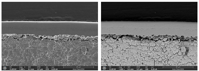 我们使用Axia ChemiSEM扫描电镜对钕铁硼的涂层进行观察(见图1)。我们的Axia ChemiSEM扫描电镜配备高质量的ETD和CBS两种探测器。CBS、ETD探测器可以同时成像,既可观察成分衬度,又能获取形貌信息(左图为ETD成像,右图为CBS成像)。从扫描电镜照片中我们可以观察到钕铁硼表面的涂层一共有3层,结合我们Axia ChemiSEM扫描电镜自带的TrueSight 能谱探测系统可知(见图2):上层和下层主要是Ni层,中间主要为Cu层,由此更能显现出我们的Axia ChemiSEM扫描电镜获得的分析结果更高效、准确,可以解决用户的实实在在的问题。