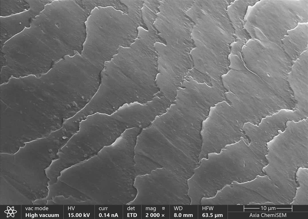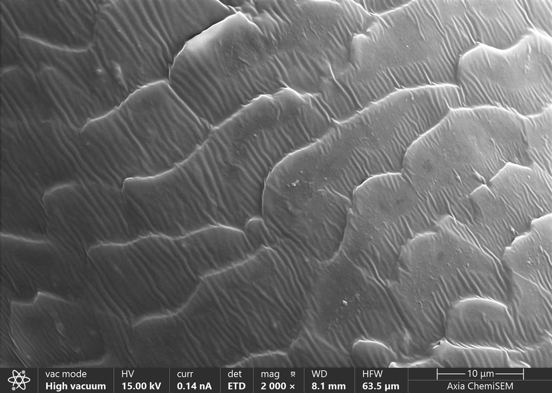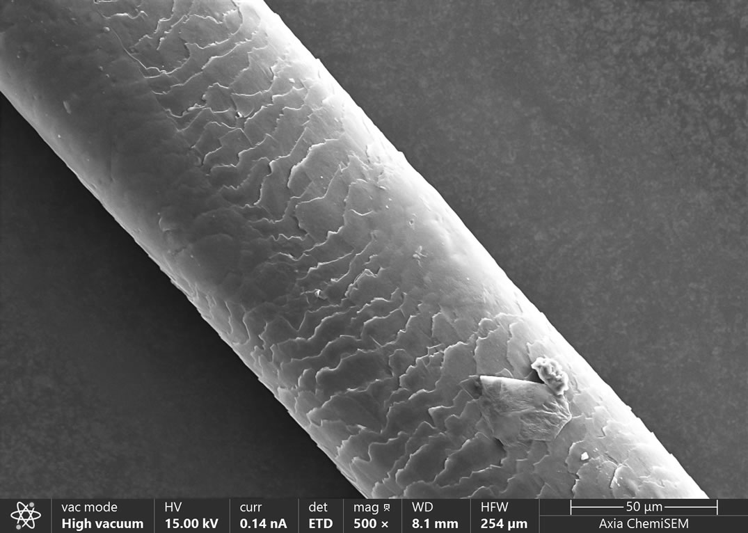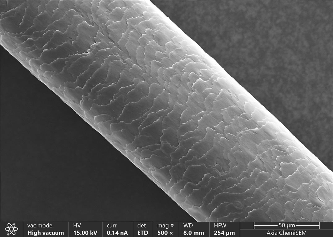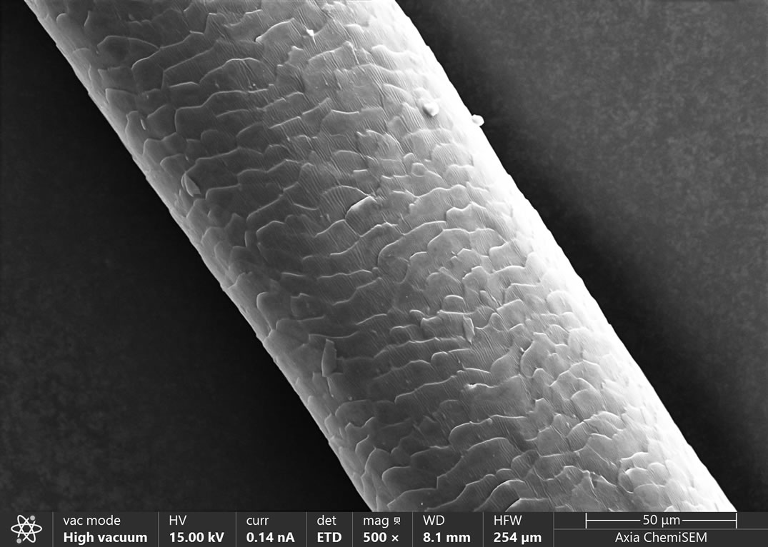 随着时代的进步和发展,人们对美的追求已经不仅仅局限于脸部皮肤的保养,手部皮肤是否细嫩,头发发丝是否呈现健康光泽,发量是否健康等都会影响一个人的整体气质。头发主要由表皮层、皮质层、髓质层等组成,表皮层主要由许多细小的鳞片重叠而成,这就是我们熟知的毛鳞片,它可以保护我们的头发抵御外界伤害。由于人眼的分辨率有限,所以我们肉眼观察不到微米级别的毛鳞片,借助Axia ChemiSEM落地式钨灯丝扫描电子显微镜,可以帮助我们观察头发毛鳞片的形貌和成分,分析它的健康程度,从而协助我们有目的性地从外到内养护我们的头发。