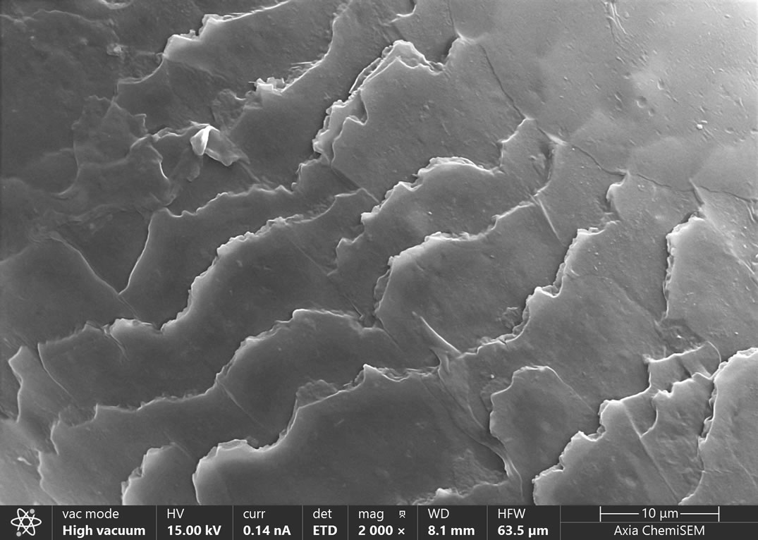 其次我们选取了使用染发剂处理过的样本B,并对其进行了显微分析,分析结果如下图所示。通过Axia ChemiSEM钨灯丝扫描电子显微镜获取的图片我们观察到,低倍下观察到的整根头发的毛鳞片闭合的紧密,经过放大以后我们观察到,发丝表面毛鳞片上覆盖了一层类似薄膜状的物质,呈现有规律的水波纹状,毛鳞片更贴合毛干。发束中毛鳞片正常情况下应该是张开的状态,在使用染发剂处理过的头发毛鳞片整齐的闭合在一起,使得头发卷翘的现象大幅度改善。