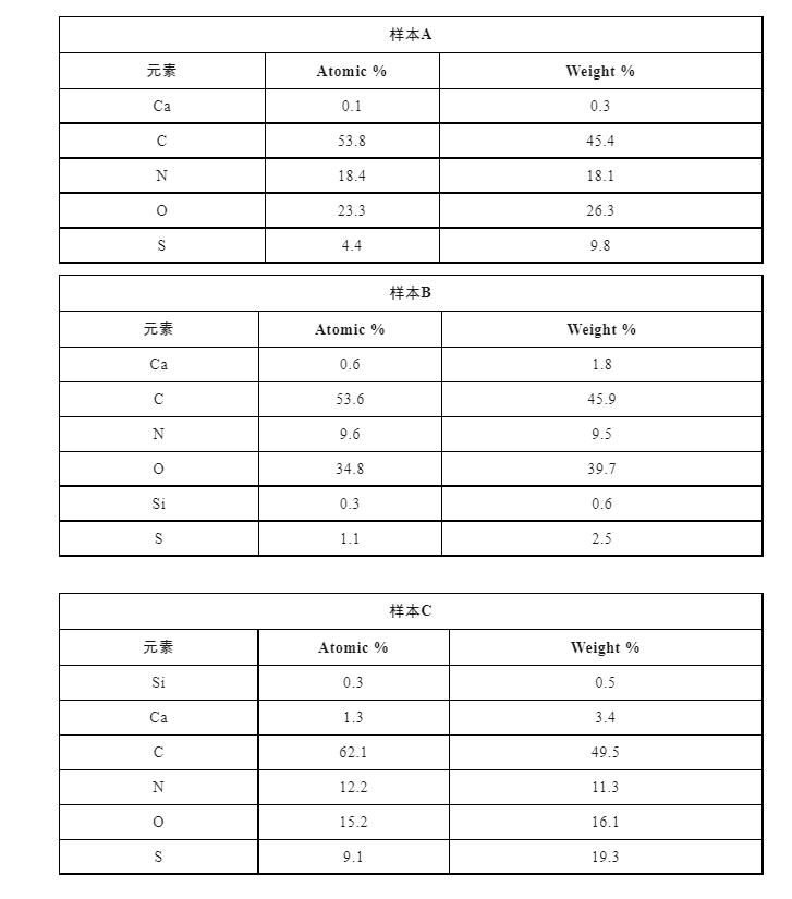 使用AxiaChemiSEM对样本进行元素分析发现,样本A与样本B、C中的元素含量差异明显,其中样本A中的Ca含量较低,B、C中的Si含量较高,这说明样本A的取样者可能缺钙,需要多摄入一些高钙的食物。B、C的Ca含量正常,但头发上含Si,说明使用的洗发产品含有硅油。