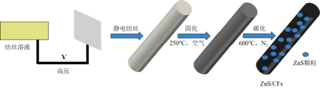 静电纺丝法制备锂电负极材料:ZnS 具有高达962 mAh g-1 的储锂理论比容量,被认为是新型LIBs 负极材料的理想候选。但其在嵌锂/脱锂过程中体积和结构的巨大变化及较弱的导电性极大地阻碍了ZnS 材料的实际应用。官鸣宇提出了采用静电纺丝法制备硫化锌/炭纤维材料(ZnS/CFs),并通过构造多孔结构和与FeS 复合的方法,优化ZnS/CFs的LIBs 储锂性能,获得了系列具有良好储锂性能的ZnS/CFs 基复合材料,如下图3。