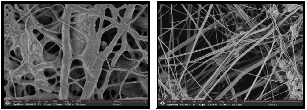 扫描电镜作为观察样品微观形貌的主要方法之一,具有高景深、高倍率、样品制备容易等多个特点。但对于堆积较厚且不均匀的静电纺丝样品而言,不易得到清晰高倍的无损图像。赛默飞超高分辨场发射扫描电镜Apreo 2兼具高质量成像和多功能分析性能于一体,采用双引擎技术,超低电压下可直接分析不导电样品,且无需做任何喷镀处理。如下图6所示,直接将静电纺丝样品置于Apreo 2电镜中,在500V低电压下轻松成像,样品无荷电且无损伤。并且凭借快捷的FLASH功能,设备可自动执行精细调节动作,只需移动几次鼠标,就可完成必要的合轴对中、消像散和图像聚焦校正,即使电镜初学者也能充分发挥Apreo 2的性能。