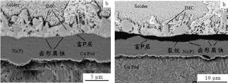 黑盘失效特征主要包括3个方面:焊接前Ni 层表面存在腐蚀状裂缝,Ni层截面存在纵向腐蚀,如图1所示;焊接后Ni层截面纵向腐蚀裂缝进一步加剧,IMC层与Ni(P)层之间可见明显富P层(P含量为焊接前的2倍或以上),如图2所示;焊点开裂发生在IMC层与Ni3P之间,断裂后的镍层表面平坦,基本无焊料残留,且可见明显泥裂,如图3所示。