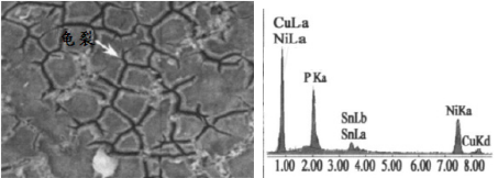 图3 ENIG镀层黑盘发生区断裂界面泥裂形貌及成分分布