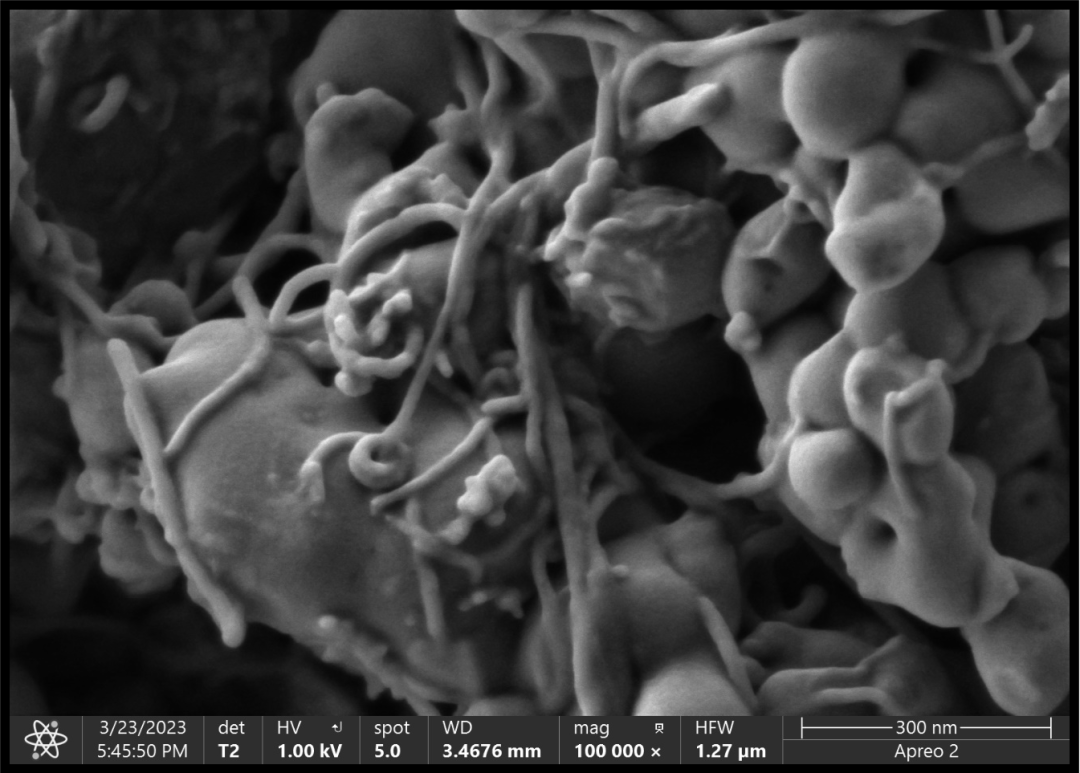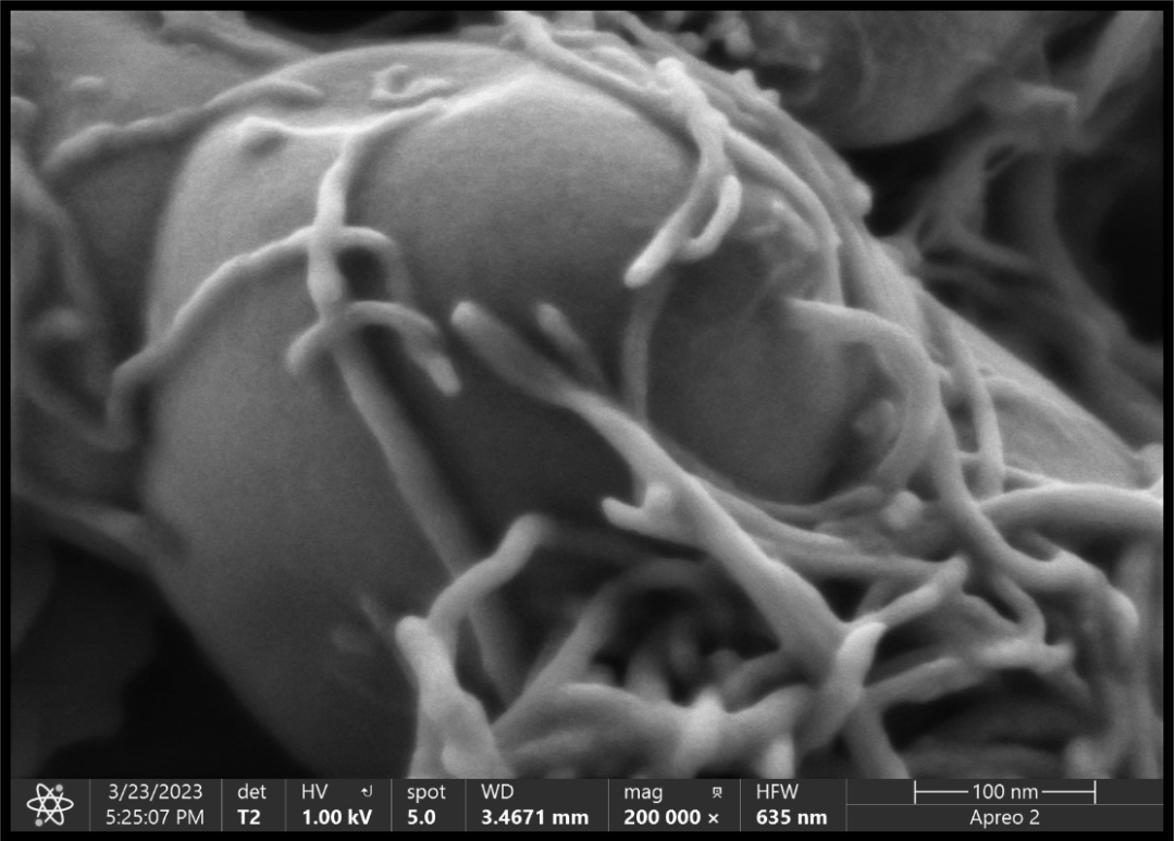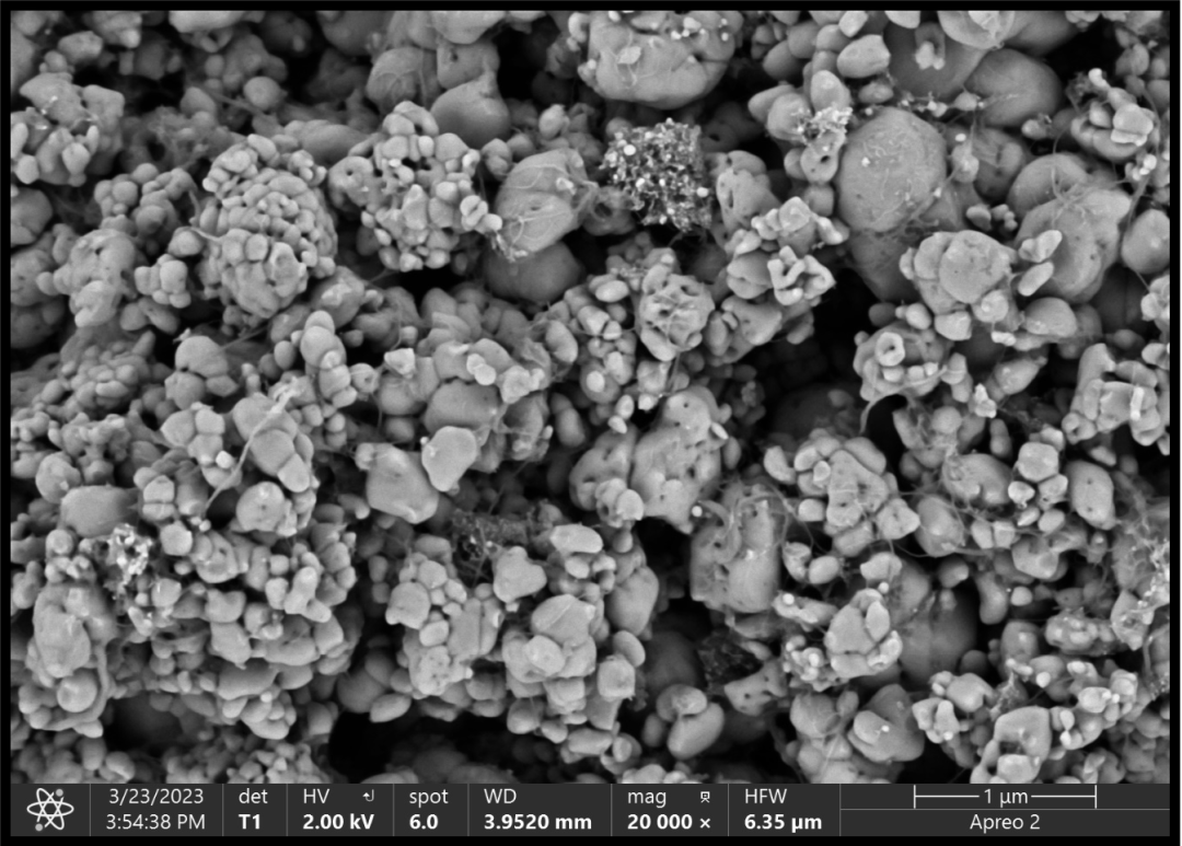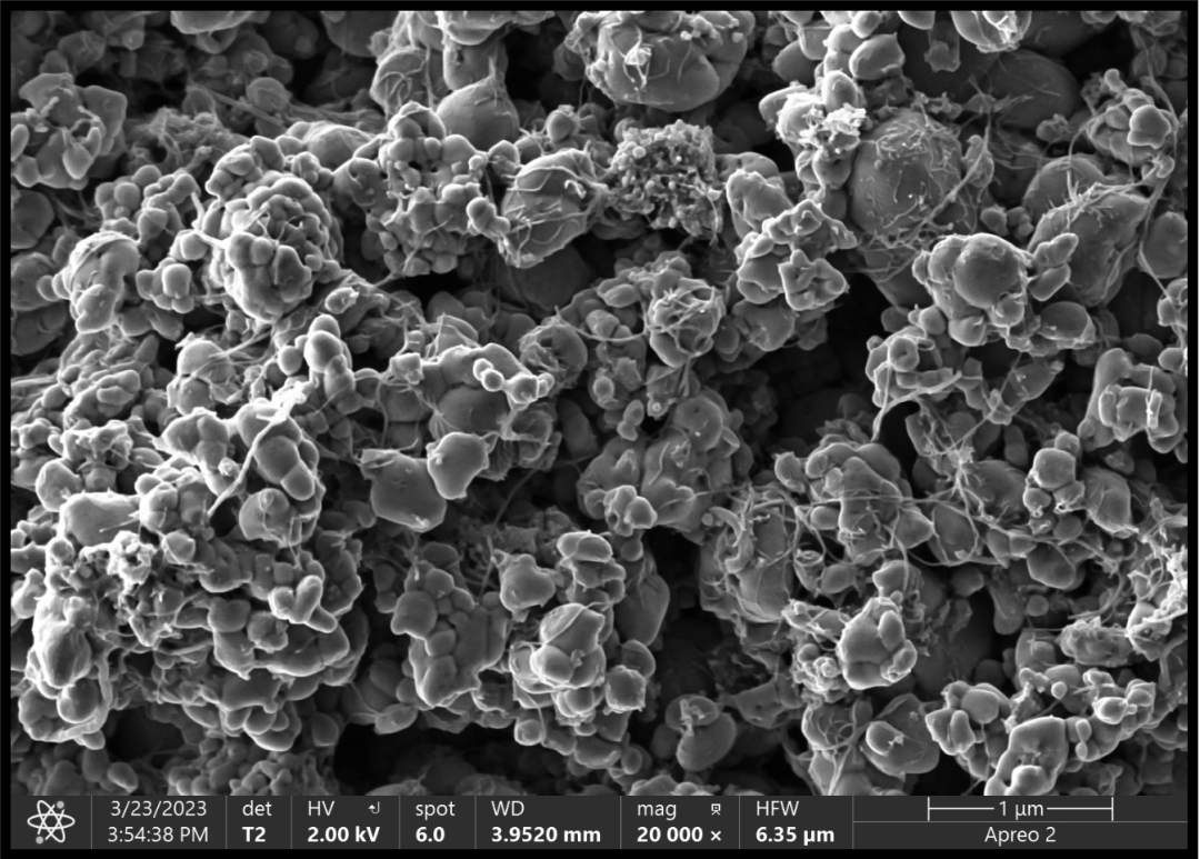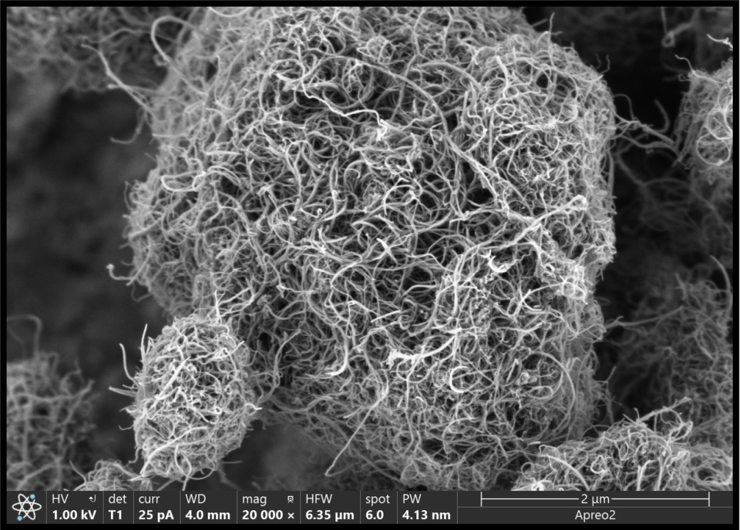 另外碳纳米管相比碳黑等材料也具有更优良的导热性能,可以促进电极材料中热量的传递和耗散,避免局部生成热点影响电池体系的安全,碳纳米管与电极活性材料相互缠绕也使电有一定的韧性,不容易在充放电过程中发生活性物质的剥离。在用Apreo 2S扫描电子显微镜的T2高分辨二次电子探测器我们可以很清晰的观察到CNTs的结构在磷酸铁锂正极粉体材料中很好地保留。