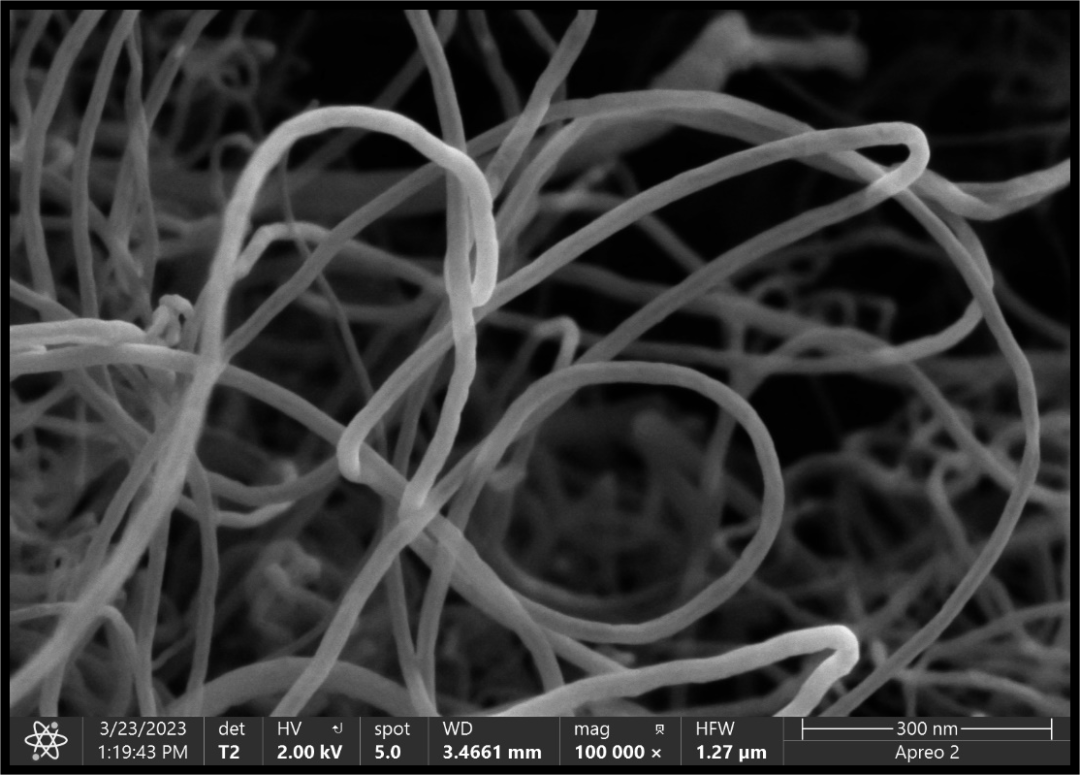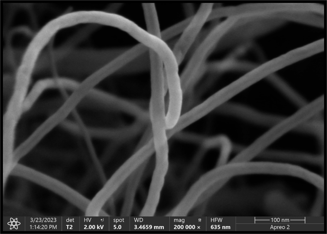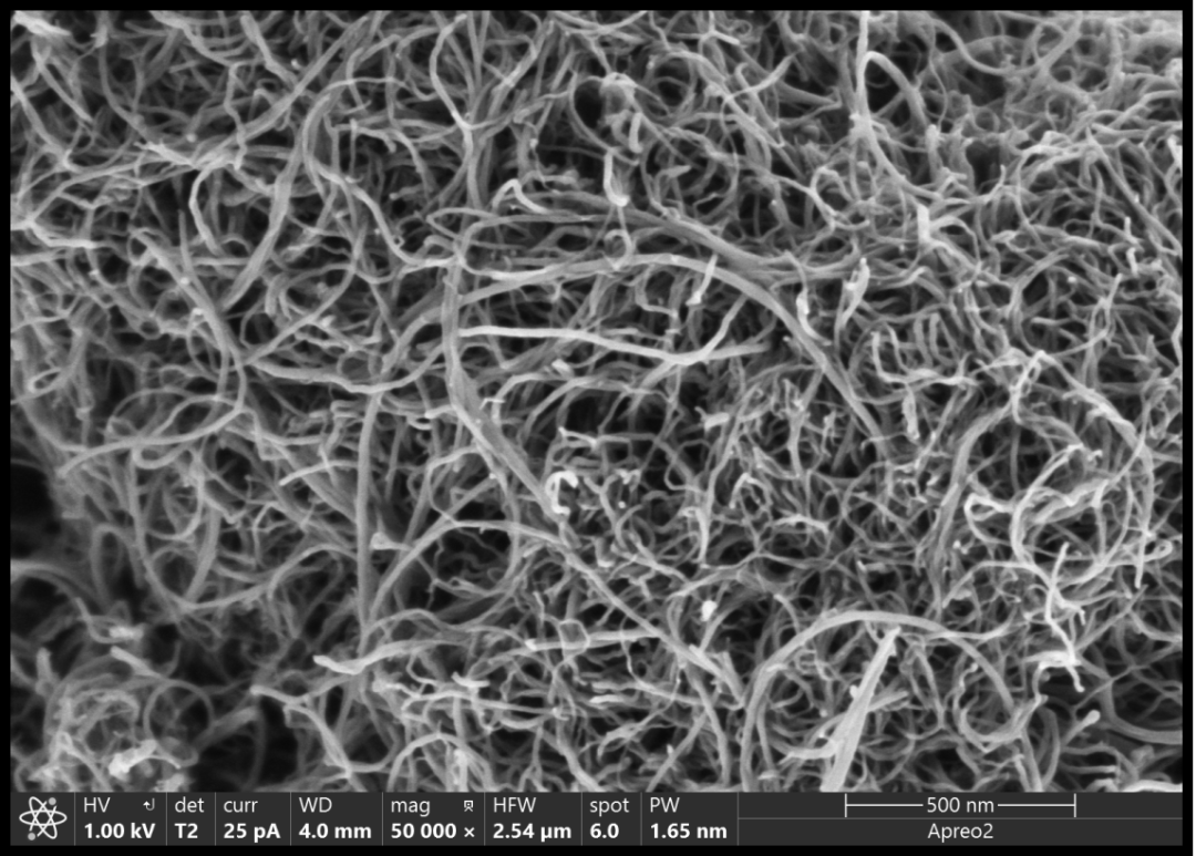 碳纳米管既可以纳米级一维材料,相互直接更容易搭接,形成导电网络,在较低的添加量下得到性能良好的电极,用碳纳米管作为导电剂,其效果明显优于碳黑。也可以用在LiFeO4、LiCoO2 等多种材料上面以提升电极的循环容量。同时其优良的导电性能,可以在一定程度上克服许多正极材料电阻率高的缺点,提高电极材料整体的功率性能,可在较大电流密度下进行充放电。碳纳米管的管径非常的小,属于纳米级的微观材料,拍摄难度较高。我们以一维的碳纳米管为例,展示Apero2S在超低电压和束流下的成像效果。