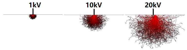 图2 不同加速电压的电子束与试样相互作用范围的示意图