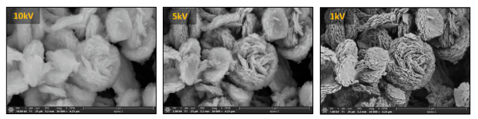 如图3所示,降低加速电压至1kV后,搭配减速模式,清楚获取到了无水磷酸铁的纳米片层结构。