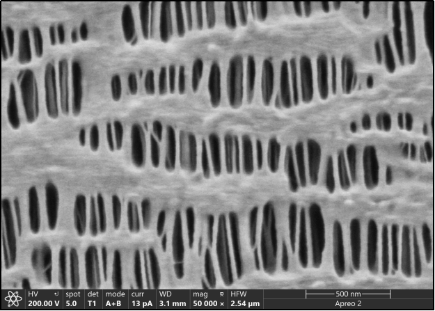 当然,开启Apreo 2中的样品台减速功能后,T1探测器也可以获取试样的形貌像,如图5所示,在200V的低电压下,开启减速模式后,T1探测器获取形貌信息,清晰呈现干法隔膜表面的纹路结构。