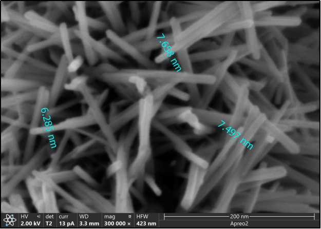 如图6所示,10万倍的氧化铝微球的T2像,可清晰观察到表面的多面体结构,图7为30万倍的MnO2催化剂,其直径小于10nm的纳米棒状结构清晰可见。