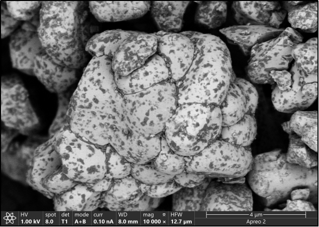 Apreo 2系列电镜还配备了YAG材质的T1背散射探测器。此类材质的探测器灵敏度极高,可获取低电压下的成分衬度像,如图4为表面负载碳的NCM颗粒的T1像,通过原子序数的差异清晰显示了用于改善NCM导电性的碳包覆物的分布情况。